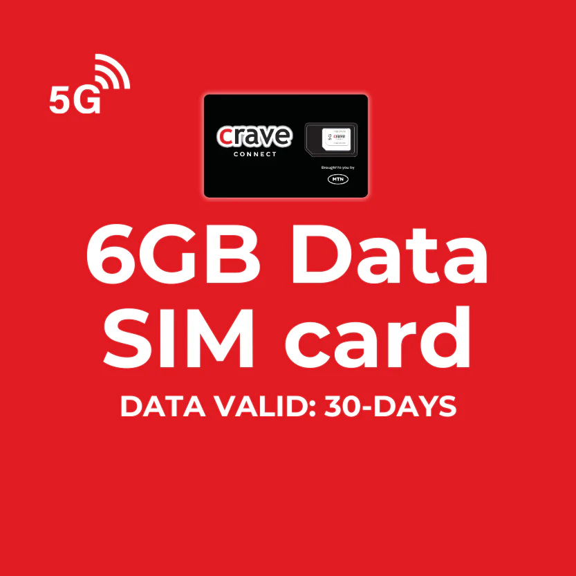The image shows a 6GB 5G Data SIM card from Crave Connect, valid for 30 days. This appears to be a prepaid data-only SIM card, likely supporting high-speed 5G connectivity. Based on available information, Crave Connect offers various data plans, including eSIM and physical SIM options, with different data allowances and validity periods (e.g., 3GB for 7 or 30 days).