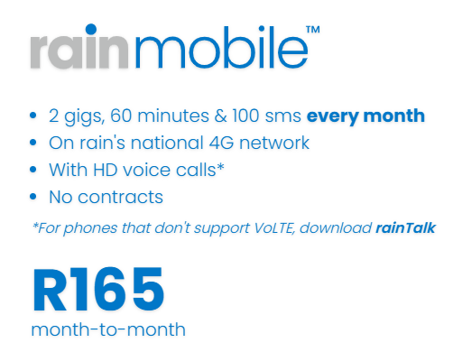 Rain Mobile plan offers 2GB data, 60 minutes, and 100 SMS monthly on a national 4G network with HD voice calls, no contracts, for R165 month-to-month. For phones without VoLTE, download Rain Talk.